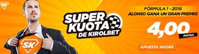 Kirolbet tiene esta semana una superkuota en la que se paga que si en la temporada de la formula 1 2018 Fernando Alonso gana al menos una carrera se paga a una cuota de 4,00 tienes de tiempo para hacerla hasta el 23 de marzo, a la que puedes acceder desde la imagen superior.